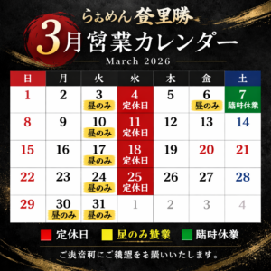 3月の営業カレンダー 2026年3月2日お知らせra-mentorikatsu 【3月営業カレンダー】 定休日 4 / 11 / 18 / 25 昼のみ営業 3 / 6 / 10 / 17 / 24 / 30 / 31 臨時休業 7 ご来店前にご確認ください。